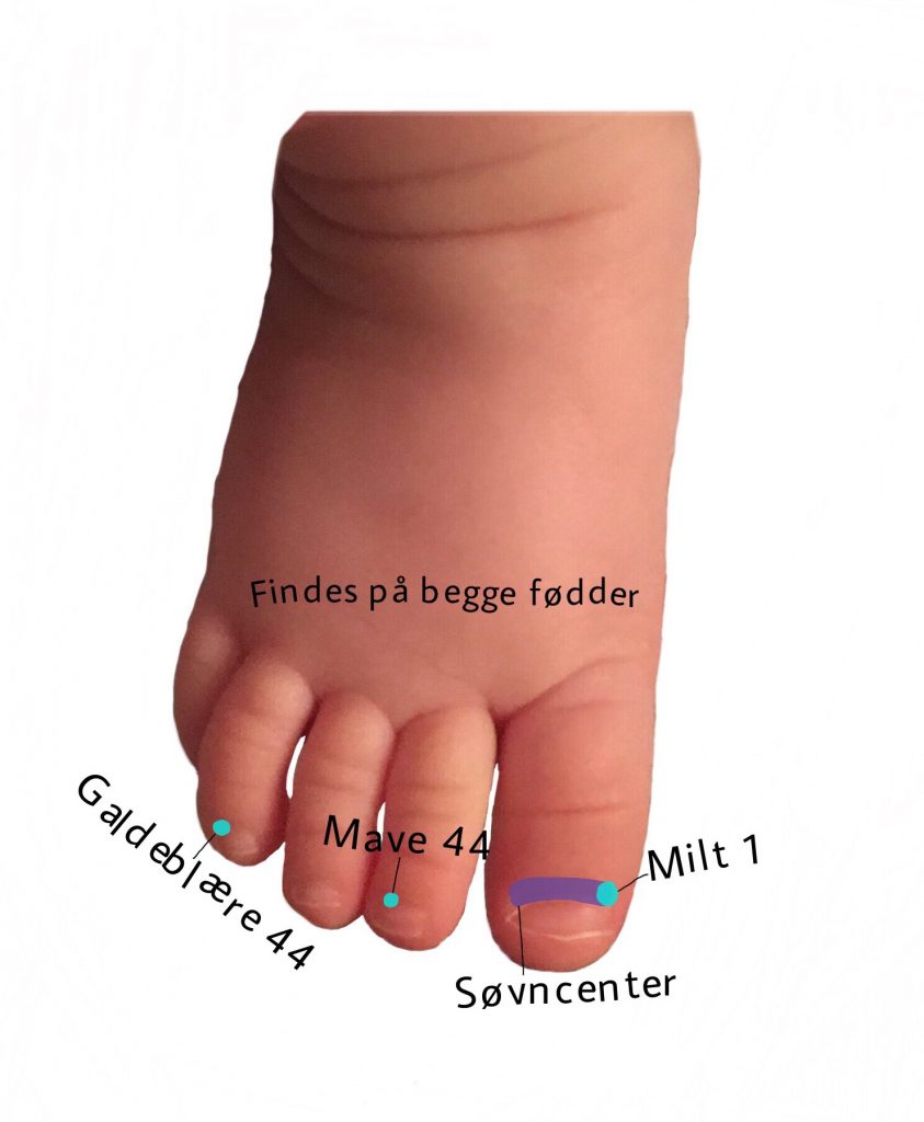 MILT 1: Punktet masséres, holdes, eller bankes på. Godt mod drømmeforstyrret søvn, natlig uro/kramper og psykiske forstyrrelser.