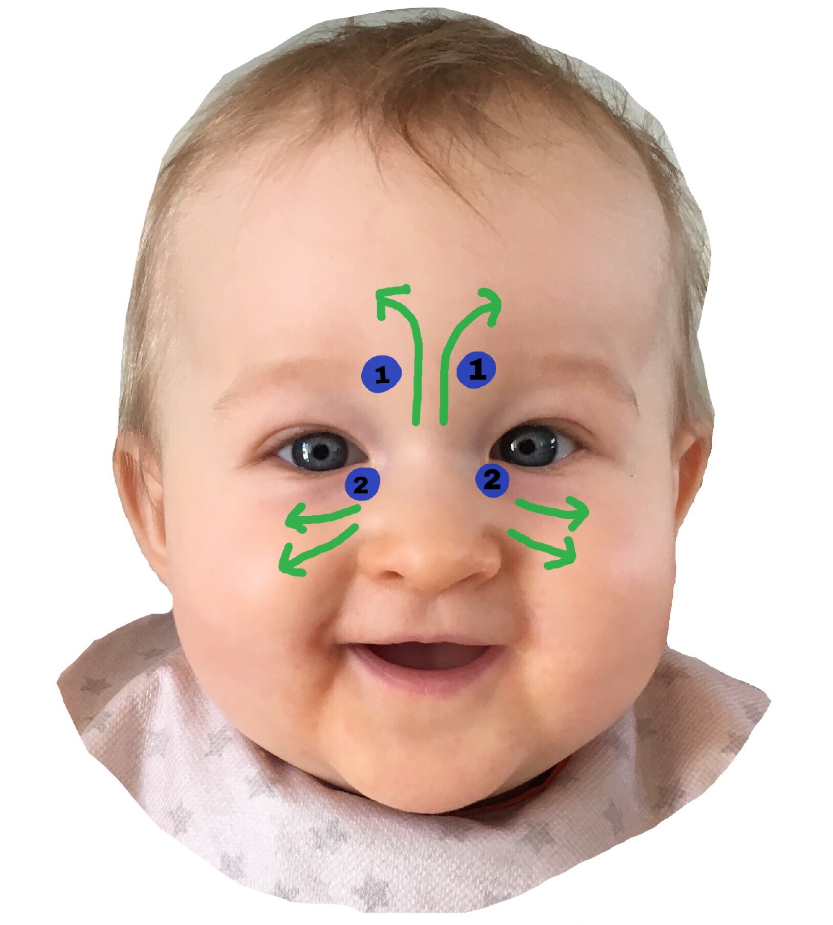Punkt 2 Punkt til at løsne op for tårekanalerne: Massér på punkterne. Gerne med et fast tryk, men hver opmærksom på at det ikke skal være ubehageligt for barnet.